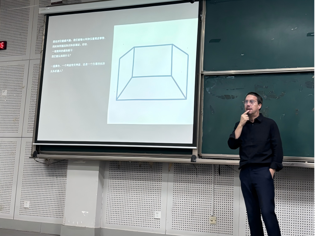 工作坊伊始,Terry Perk教授以“科技如何改变认知”为切入点,通过电影案例与视觉实验展开讲解。他引用《绘图师的契约》等影片片段,指出手机、相机、VR眼镜等科技产品如同“框架滤镜”,会重构人们对现实世界的几何认知与情感体验;同时展示“一物三视”的视觉实验——一张图像可被解读为舞台、截顶金字塔或无头机器人,生动诠释“多重稳定性感知”理论,强调“认知经验与视角选择共同决定我们所见的世界”。